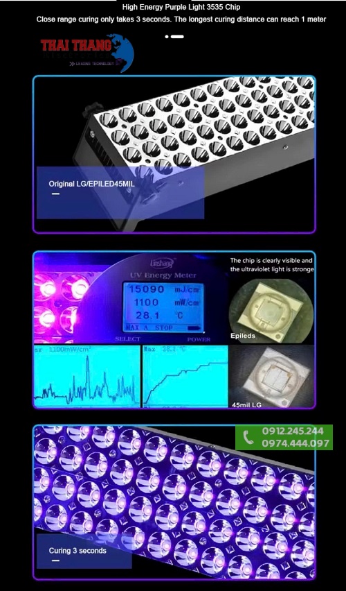 Đèn UV công suất cao Winning light D3280 Nguồn sáng lạnh,nhiệt độ bề mặt của vật thể được chiếu sáng tăng chậm,giải quyết vấn đề tỏa nhiệt cao làm ảnh hưởng đến bề mặt trang thiết bị,đồ dùng,tiêu thụ năng lượng thấp,công suất đạt 100w cho bước sóng uv 405nm,cường độ chiếu xạ 1200 mW/cm²,góc chiếu rộng 120 độ tăng hiệu quả quét bao phủ bề mặt,đặc biệt hiệu quả làm nhanh khô keo,sơn trong sản xuất,sửa ... |