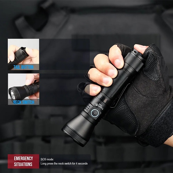 - Bên cạnh đó, T40R còn tích hợp hai chế độ đặc biệt quan trọng: Strobe (Nhấp nháy) 1800 lumen để gây mất phương hướng và SOS để phát tín hiệu khẩn cấp, cả hai đều được kích hoạt nhanh chóng qua công tắc thân.