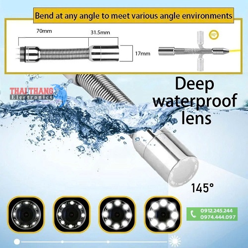 - Đầu camera có thể uốn cong theo hướng của đường ống