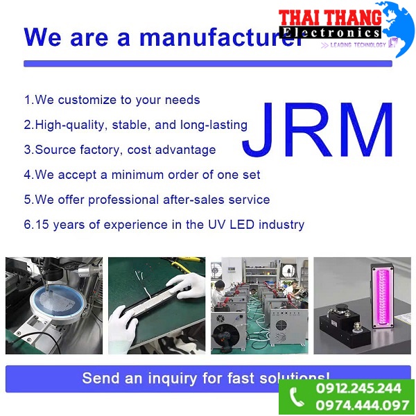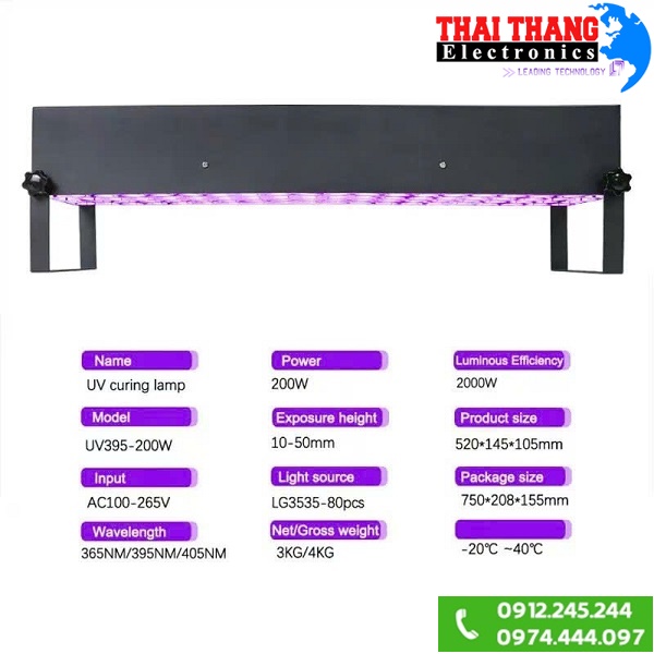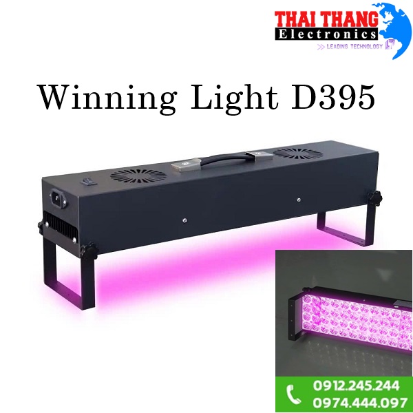 Đèn UV công suất cao Winning light D395 Nguồn sáng lạnh,nhiệt độ bề mặt của vật thể được chiếu sáng tăng chậm,giải quyết vấn đề tỏa nhiệt cao làm ảnh hưởng đến bề mặt trang thiết bị,đồ dùng,tiêu thụ năng lượng thấp,công suất đạt 200w cho bước sóng uv 395nm,cường độ chiếu xạ 2700 mW/cm²,góc chiếu rộng 120 độ tăng hiệu quả quét bao phủ bề mặt,đặc biệt hiệu quả làm nhanh khô keo,sơn trong sản xuất,sửa chữa lắp ráp,.v.v.. Dễ dàng lắp đặt cho nhiều loại máy móc công nghiệp.