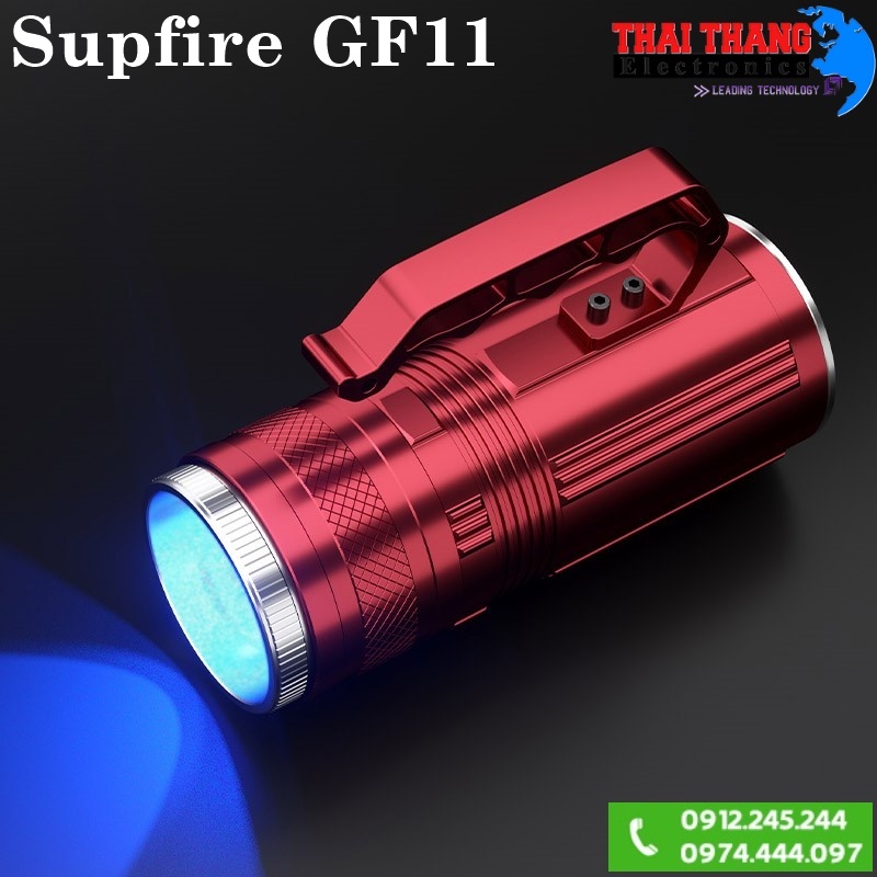 Đèn pin đa năng soi siêu xa Supfire GF11 sử dụng nguồn sáng là bóng led lõi tứ công suất 10W với 2 màu sáng trắng và xanh dương, khi chọn chế độ sáng xanh dương vào mục đích đánh bắt cá, đèn sẽ làm nổi bật lên các vật như phao dây câu, phao lưới, và các loại thủy sản màu trắng. Đèn trang bị hệ thống zoom tụ tỏa cho phép người dùng có thể điều chỉnh chùm tia cho phù hợp với công việc, đầu đèn trang bị 2 lớp kính lúp cho khoảng cách chiếu 280m trong đêm. Chất liệu của đèn làm bằng hợp kim nhôm hàng không mang lại trọng lượng nhẹ cho đèn, chất liệu siêu bền này cũng giúp đèn chịu được các tác động như va đập, rơi rớt, ăn mòn của nước biển. Đèn được thiết kế thêm tay cầm (có thể tháo rời) giúp thoải mái hơn trong việc cầm nắm sử dụng đèn. Đuôi đèn thiết kế công tắc bật tắt đèn, đồng thời là nút chuyển chế độ màu của đèn, 2 nút 2 bên có chức năng tăng hoặc giảm độ sáng của đèn và thêm màn hình hiển thị mức độ sáng của đèn. Thân đèn tích hợp thêm ren cho phép người dùng gắn cố định đèn trên chân tripod. 1 cổng USB cũng được tích hợp trên đèn để sạc ngược lại cho các thiết bị di động.