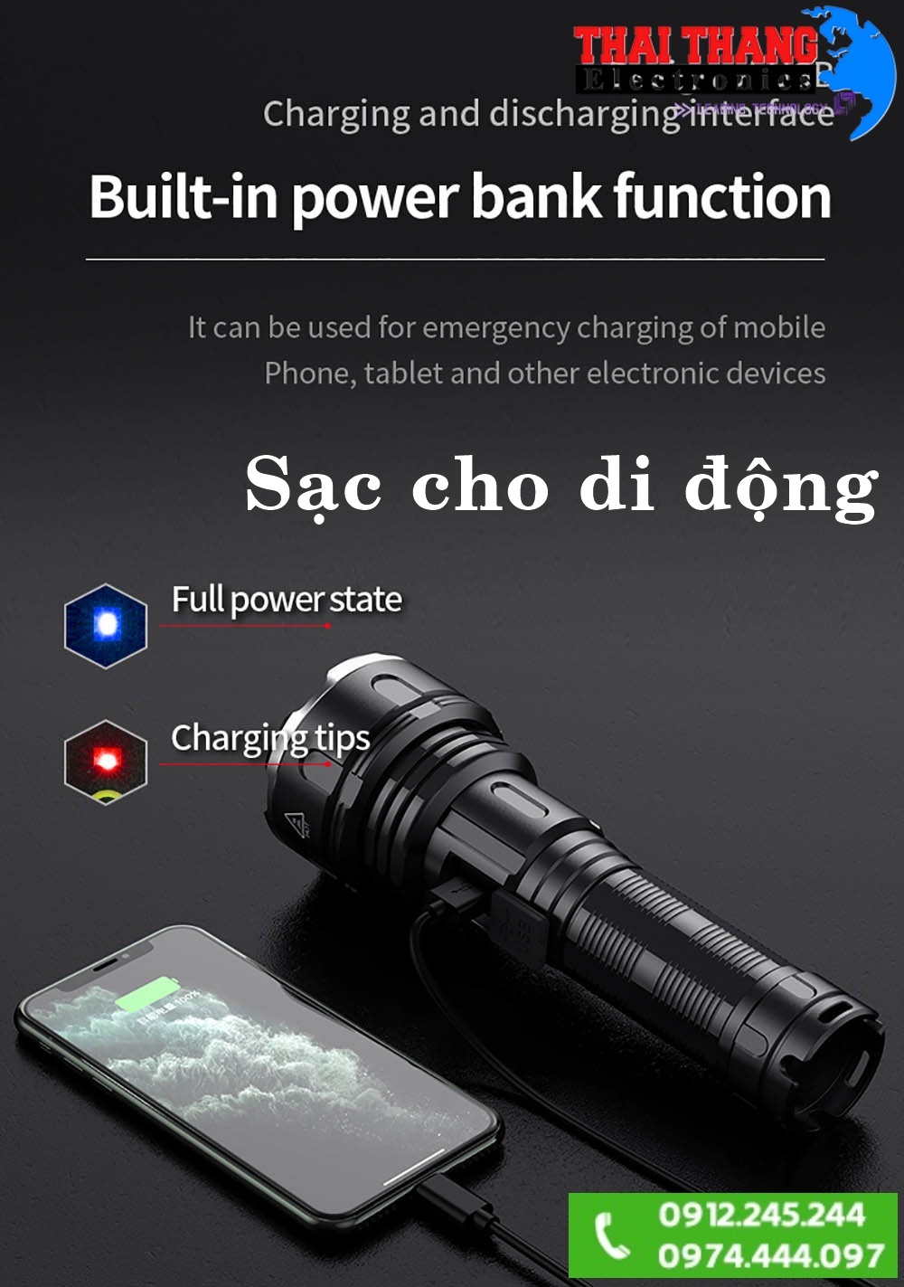 - Sử dụng nguồn là pin sạc 26650 có thể sạc lại được