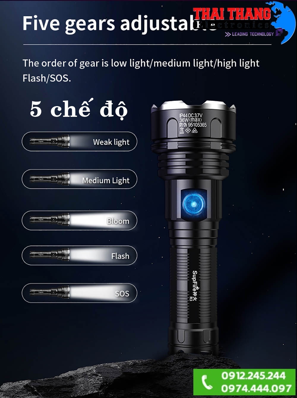 - Đèn có 5 chế độ chiếu sáng khác nhau đối với led chính
