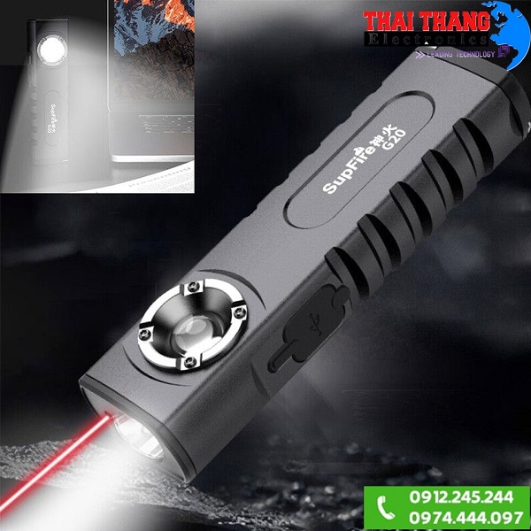 Đèn pin kèm laser Superfire G20 Dòng sản phẩm đa năng có thiết kế nhỏ gọn, độ sáng cao, đặc biệt trang bị thêm đèn laser thích hợp cho nhiều công việc khác nhau như xây dựng, thi công nội thất, cắm trại,du lịch dã ngoại, sửa chữa máy móc, chiếu sáng gia đình,….