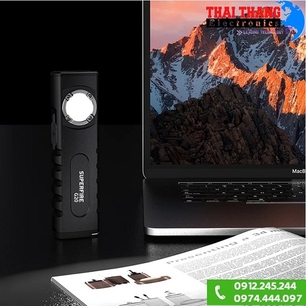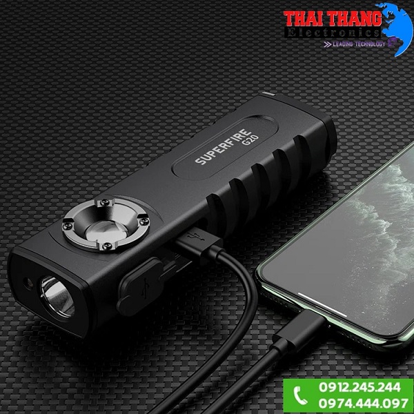 Đèn pin bỏ túi Superfire G20 Thiết kế thêm nam châm phía chân đèn và móc treo giúp cố định đèn ở các vị trí thích hợp, sử dụng khi sửa chữa máy hoặc cắm trại,chất liệu làm từ hợp kim nhôm siêu bền,chịu được tác động mạnh và mang lại trọng lượng nhẹ chỉ 220g,chuẩn chống nước IP44 giúp hoạt động tốt trong môi trường khắc nghiệt,sử dụng pin sạc dụng lượng 2000mAh cho thời gian hoạt động từ 3 đến 7 giờ.
