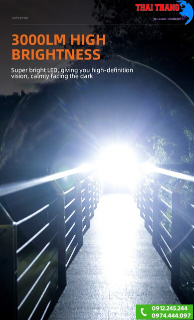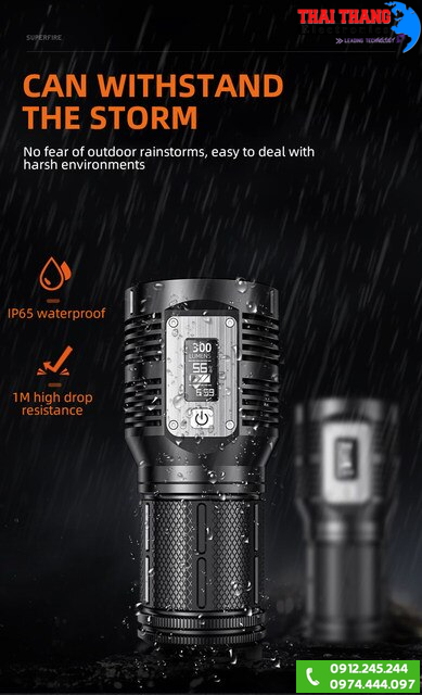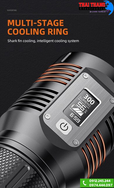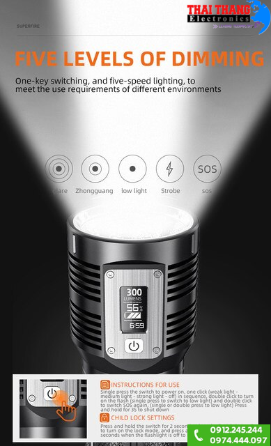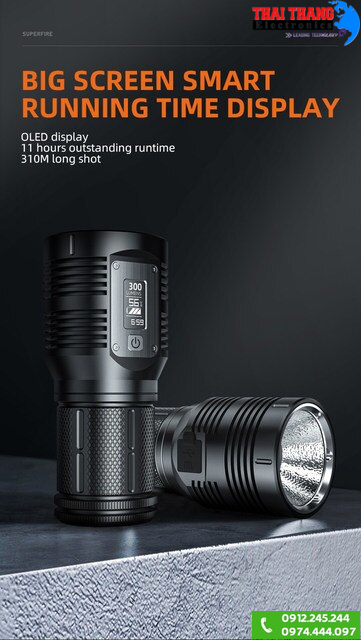 Đèn pin cầm tay siêu sáng Superfire M5 Sử dụng chip led SH-S11 lõi tứ, công suất 36W cho cường độ sáng lên đến 3000 lumens,hỗ trợ các chế độ sáng đa dạng cho người dùng lựa chọn gồm sáng thấp 300lumens, sáng mạnh 1000lumens, siêu sáng 3000lumens, nhấp nháy và chế độ SOS,khoảng cách chiếu xa của đèn đạt 310m nhờ vào chóa đèn sâu và rộng, kết hợp công nghệ mạ nhôm sần và tráng gương truyền sáng trên phần kính cường lực,đặc biệt dòng M5 sẽ được trang bị công tắc an toàn nhằm tránh tình trạng đèn bật ngoài ý muốn trong quá trình bảo quản hoặc vận chuyển sản phẩm,màn hình Oled độ nét cao hiển thị các thông tin về cường độ sáng của từng chế độ, phần trăm pin còn lại và thời gian sử dụng còn lại của từng chế độ.