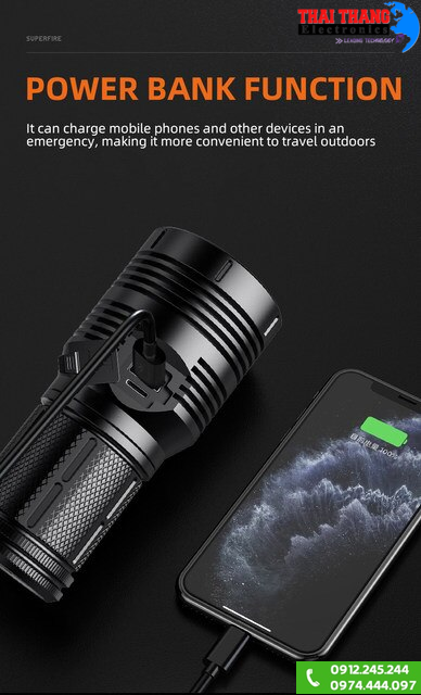 Đèn pin tuần tra siêu sáng Superfire M5 Nguồn sử dụng 4 pin 18650 cho tổng dung lượng cao,cho thời gian hoạt động đến 11.5 giờ ( tùy chế độ sáng ) ngoài cổng sạc Type-C, đèn còn được thiết kế thêm cổng USB để sạc cho các thiết bị di động.