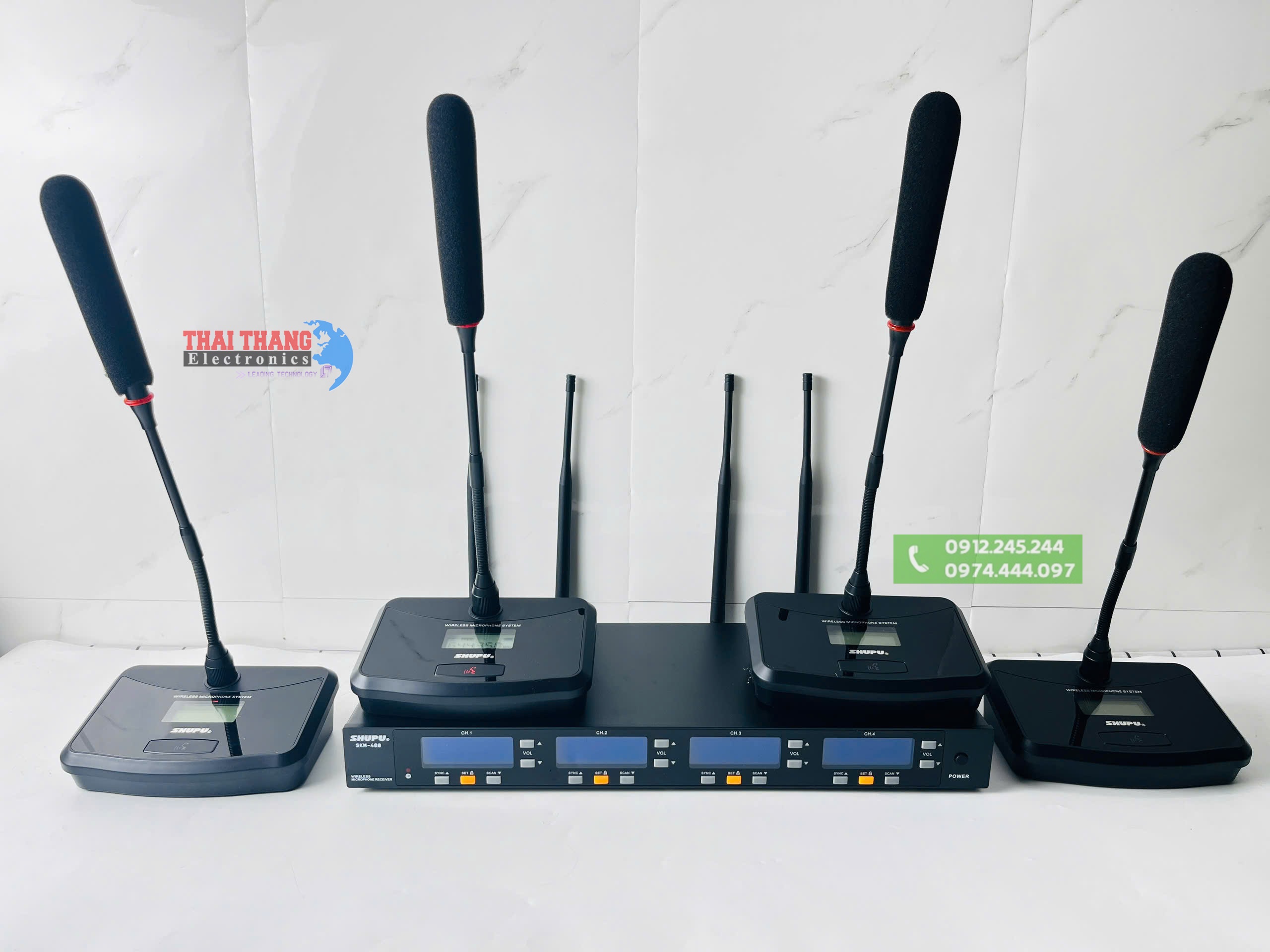 Micro cổ ngỗng không dây Shupu SKM400 Sử dụng 4 mic không dây với màn hình hiển thị thông tin trên từng mic,màn hình này cho phép hiển thị thông tin về tần số, tín hiệu hay kênh đang được lựa chọn riêng biệt cho từng micro,có phím bấm trên thân mic giúp chủ động bật tắt micro,thiết kế cần mic dài 35cm cho độ nhạy cao,thuận tiện sử dụng ngay cả khi ngồi hoặc đứng phát biểu.