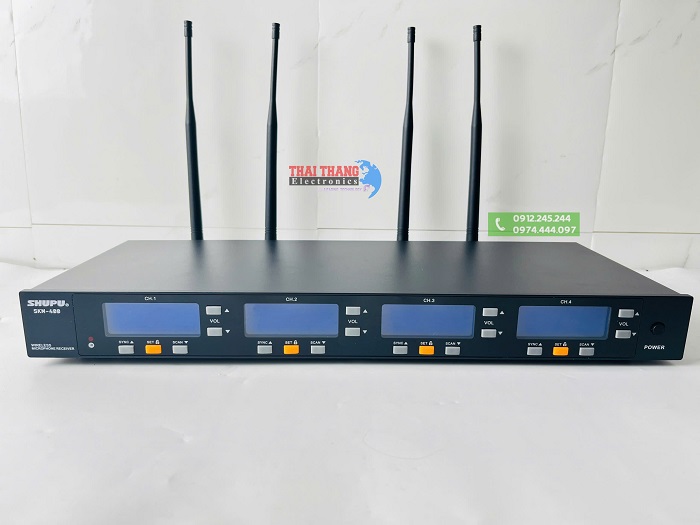 Micro hội nghị không dây chuyên nghiệp Shupu SKM400 Bộ trung tâm thu tín hiệu có màn hình hiển thị thông tin tần số kết nối cho cả 4 mic,điều chỉnh kênh,tần số riêng biệt đảm bảo tín hiệu kết nối với amply hay các thiết bị âm thanh khác được tốt nhất.
