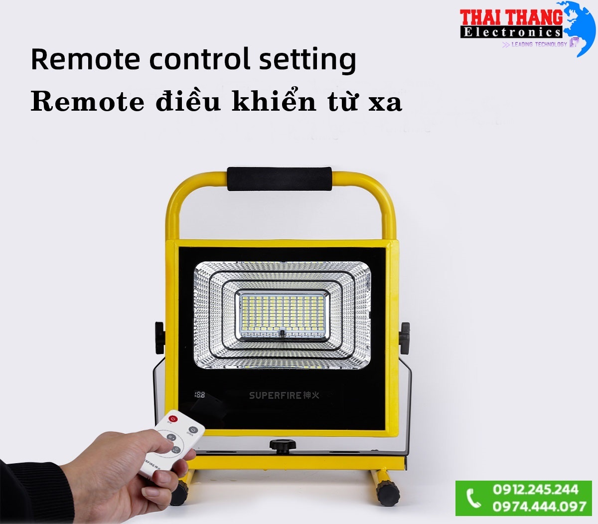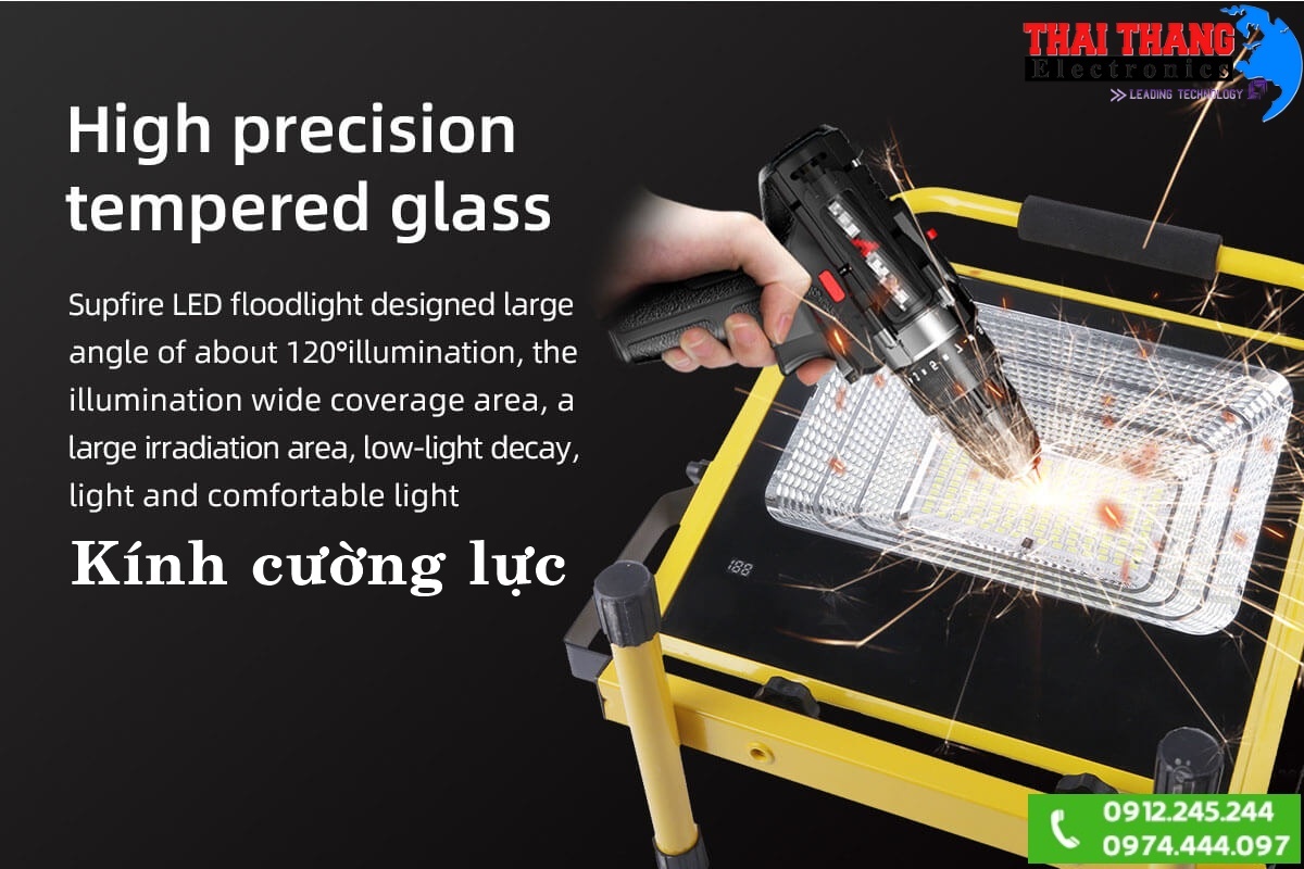 Đèn pin siêu sáng cho công trình Supfire FS1-A được thiết kế đến 48 chip led sáng trắn cho cường độ sáng đạt 850 lumen, dãi nhiệt màu 8000K. Ngoài led chính đèn còn được thiết kế thêm 8 đèn led cảnh báo xanh dương đỏ sử dụng cho các trường hợp khẩn cấp. Chóa đèn thiết kế sâu, rộng và được tráng gương chuyên dụng tăng phản xạ ánh sáng cho diện tích phát sáng lên đến 30m². Đèn có 3 chế độ sáng gồm sáng mạnh, sáng vừa và nhấp nháy xanh đỏ, người dùng có thể dễ dàng điều chỉnh độ sáng và thời gian chiếu sáng từ xa thông qua remote kèm theo sản phẩm. Đèn được gắn trên khung có thể xoay 360° dễ dàng điều chỉnh hướng chiếu sáng hoặc gắn cố định trên cao. Mặt kính cường lực siêu cứng, chuẩn chống nước IP54 giúp đèn chịu được các tác động trực tiếp từ con người hoặc thiên nhiên.