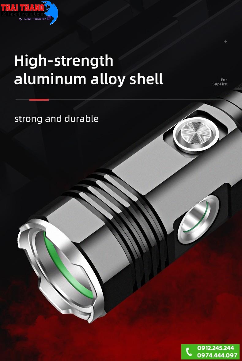 - SUPFIRE X8-T6 có thiết kế nhỏ gọn rắn chắc,vỏ ngoài làm bằng hợp kim nhôm T6063-T6 chuyên dùng trong hàng không nên chống va đập rất tốt,thân đèn tạo
