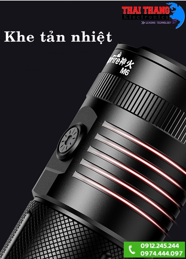 Đèn pin Supfire New M6-T6 3 bóng Led T6 trong 1 - 2000Lm. Với 3 bóng led Cree XMLT6 siêu sáng trong 1 mặc dù thiết kế với 3 bóng led trong 1 nhưng khi soi ra ngoài vẫn tụ vào một vòng tròn duy nhất nên độ soi xa rất tuyệt vời, đèn pin Supfire New M6-T6 cho cường độ sáng siêu khủng lên tới 2000 Lumen, với khả năng soi xa khủng khiếp trên 1000m. Phiên bản mới 2013 có thêm Gen gắn được vào chân máy ảnh để làm đèn chiếu sân khấu hoặc làm phim, hay giúp bạn rảnh tay khi sửa xe trên đường cao tốc...