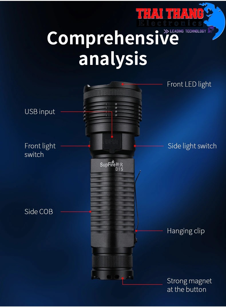 Đèn pin chính hãng Supfire D15 sử dụng nguồn sáng là bóng led P90 của Mỹ với công suất 36W và cường độ sáng đạt 2000 lumens, led chính này được trang bị 5 chế độ sáng gồm sáng yếu, sáng vừa, sáng mạnh, nhấp nháy và chế độ SOS giúp đèn có thể sử dụng trong nhiều hoạt động khác nhau. Ngoài ra đèn còn được trang bị thêm 1 dãy led phụ COB trên thân đèn với độ sáng cao thích hợp cho các công việc chiếu gần, led COB này sẽ có 3 chế độ sáng trắng mạnh, sáng trắng vừa và đỏ nhấp nháy. Đèn trang bị hệ thống chóa đèn thông minh được thiết kế nhẵn và sâu với chất liệu nhôm sần cao cấp và được tráng 2 lớp bạc tăng cường phản xạ ánh sáng, kết hợp với phần kính bảo vệ cũng được phủ nhiều lớp tăng cường khả năng truyền ánh sáng cho khoảng cách chiếu của đèn lên đến hơn 200m trong đêm tối. Người dùng có thể sạc cho các thiết bị di động thông qua cổng USB trên thân đèn. Ngoài ra đuôi đèn trang bị 1 nam châm từ tính mạnh giúp người dùng gắn cố định đèn ở vị trí mong muốn, thân đèn trang bị thêm 1 kẹp giúp đèn có thể được kẹp vào thắt lưng, túi quần, túi áo hoặc balo, lều trại. Sản phẩm đạt tiêu chuẩn chống nước IP44 cho phép đèn có thể hoạt động tốt trong môi trường khắc nghiệt nhất