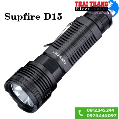 Đèn pin cầm tay siêu sáng Supfire D15 có chất liệu làm từ hợp kim nhôm hàng không AL6061T6 cao cấp mang lại trọng lượng nhẹ và có thể chịu các tác động mạnh như va đập hoặc rơi rớt. Các khe tản nhiệt cũng được tiện CNC trên thân giúp đèn hoạt động trong thời gian dài mà không bị nóng. Đèn sử dụng nguồn năng lượng là pin 26650 dung lượng cao cho thời gian hoạt động lên đến 3 giờ tùy chế độ sáng.