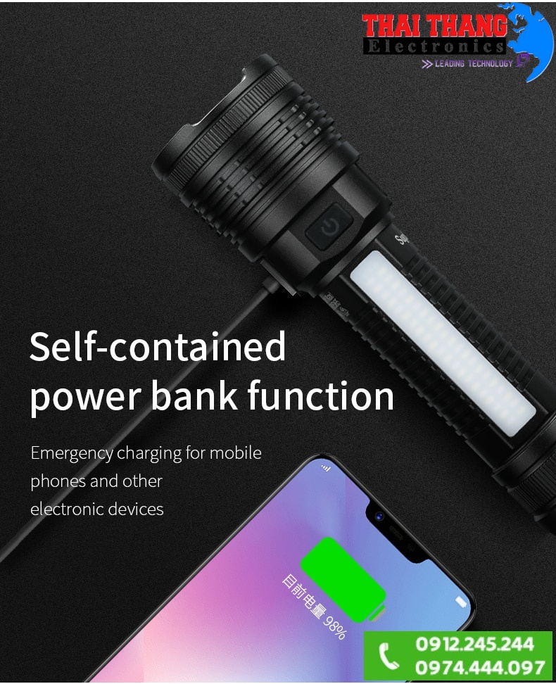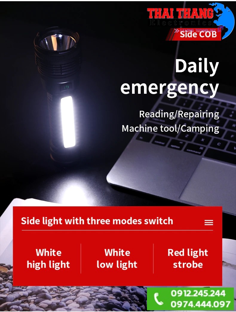 + đèn có 3 chức năng sáng chói,sáng mờ và chế độ tự vệ nhấp nháy liên tục.