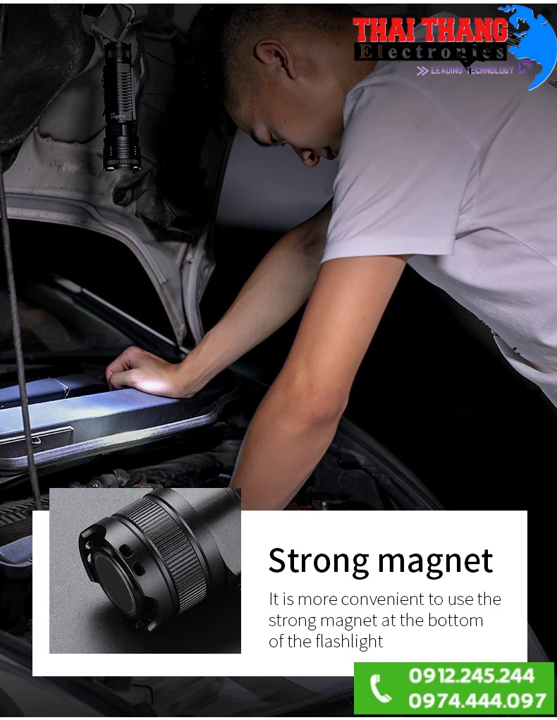 - Tích hợp nam châm ở đuôi đèn giúp cố định đèn lên các bề mặt kim loại