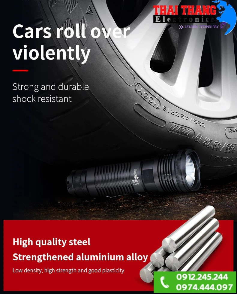 - SUPFIRE X8-T6 có thiết kế nhỏ gọn rắn chắc,vỏ ngoài làm bằng hợp kim nhôm T6063-T6 chuyên dùng trong hàng không nên chống va đập rất tốt,thân đèn tạo