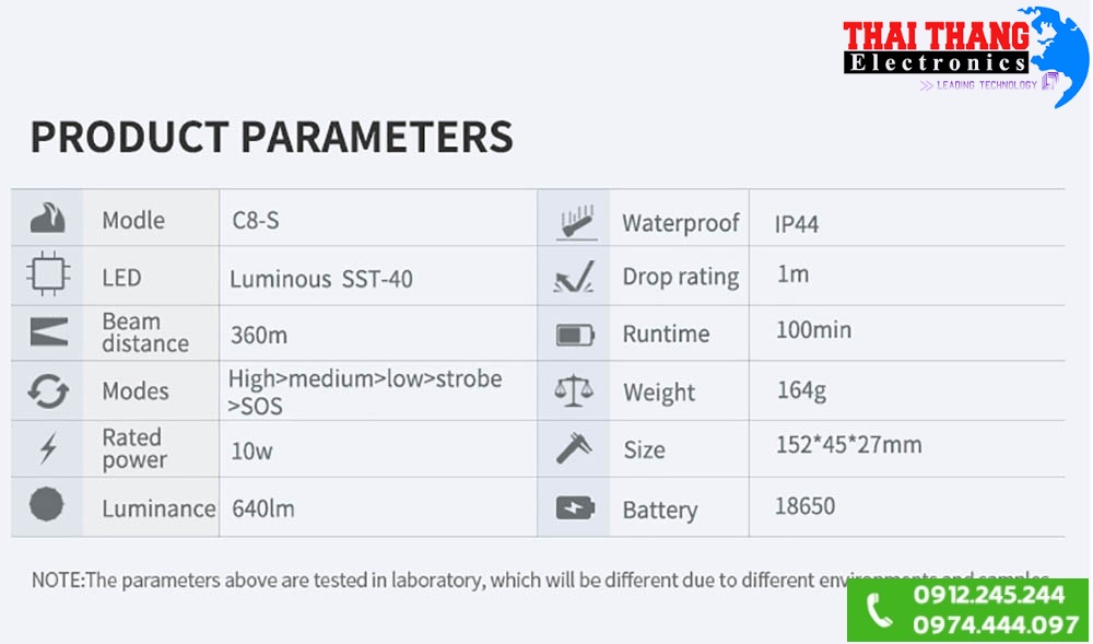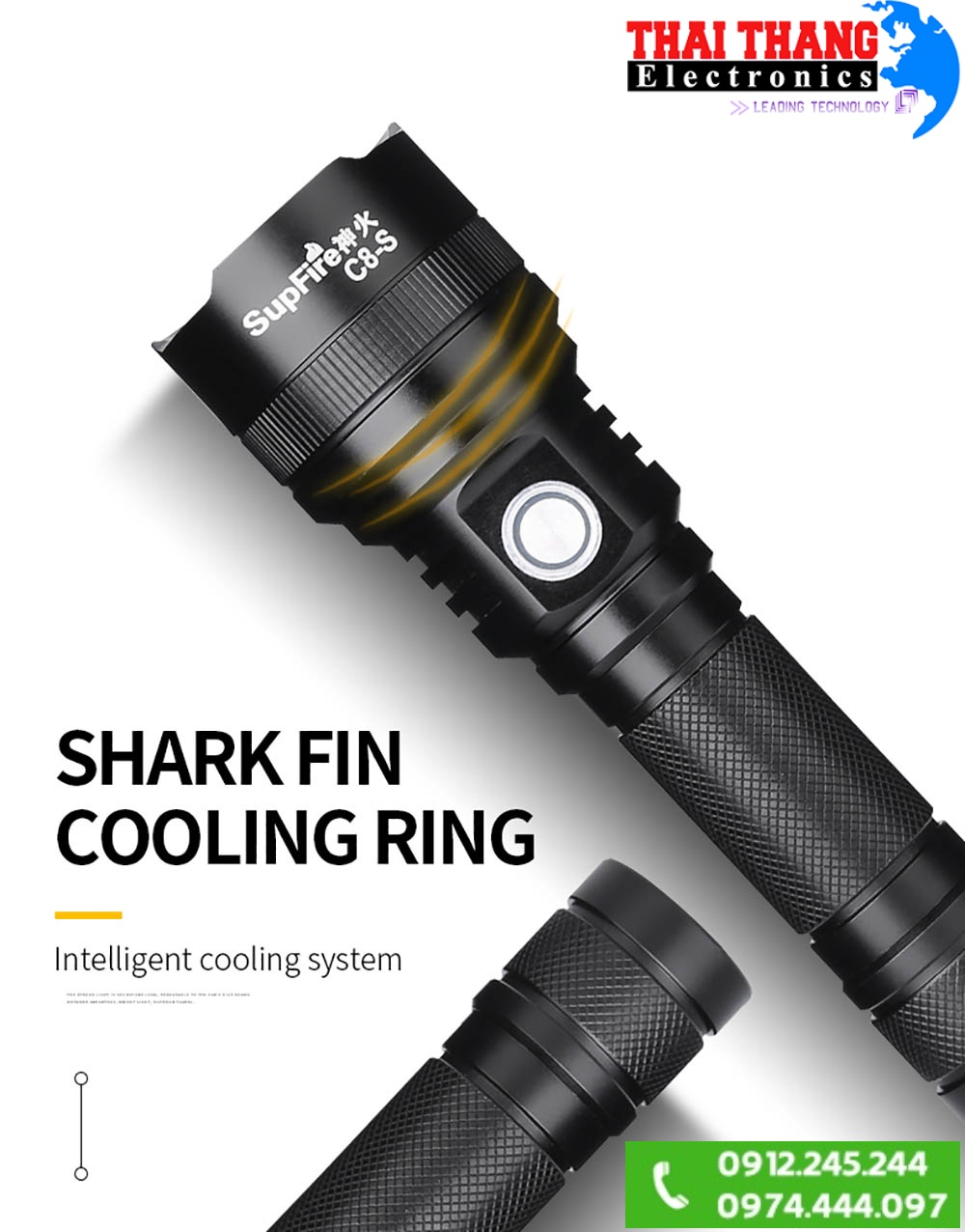 Đèn pin chính hãng Supfire C8-S trang bị bóng led Luminus SST-40 công suất 10W cho ánh sáng trắng, cường độ sáng cao nhất đạt 640 lumen. Đèn có 5 chế độ sáng gồm sáng mạnh, sáng vừa, sáng yếu, nhấp nháy và SOS. Chất liệu đèn làm bằng hợp kim nhôm hàng không AL6061-T6 chịu đập rơi rớt với độ cao 1m, bên ngoài đèn được mạ Anodize chống ăn mòn hoặc oxy hóa. Khoảng cách soi của đèn lên đến 360m trong đêm nhờ vào thiết kế chóa rộng, sâu và chóa này được tráng gương phản xạ ánh sáng kết hợp lớp truyền sáng chuyên dụng ở phần kính. Thân đèn được tiện CNC các khe rãnh tản nhiệt giúp đèn hoạt động trong thời gian dài mà không bị nóng. Đuôi đèn tích hợp nam châm từ tính mạnh cho phép người dùng cố định đèn ở các bề mặt kim loại giúp người dùng rảnh tay để thực hiện các công việc khác như sửa chữa, cắm trại,….