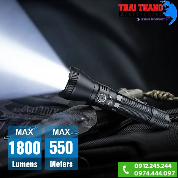 - Chế độ siêu sáng (1800 LM): Cung cấp sức mạnh tối đa để tìm kiếm tầm xa hoặc trong tình huống khẩn cấp, hoạt động liên tục trong 189 phút.