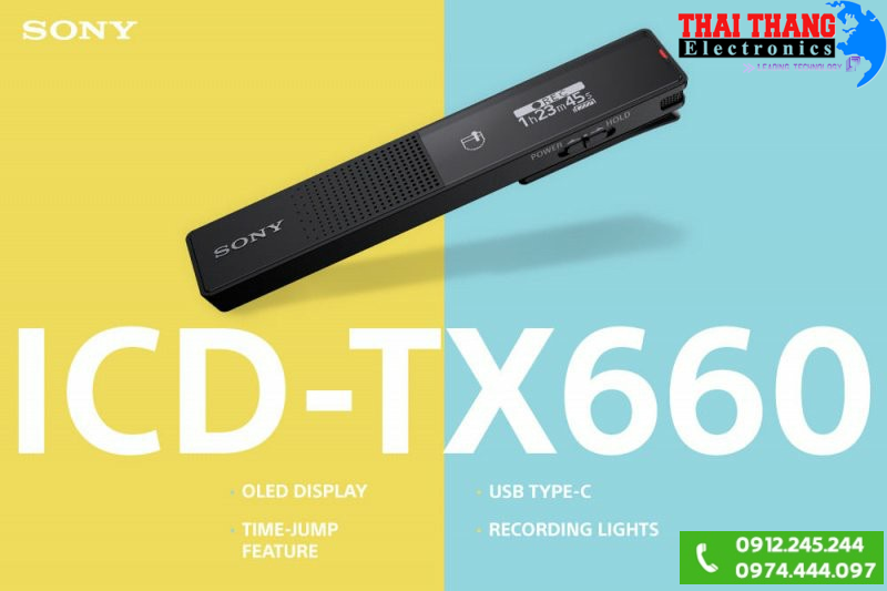 Máy ghi âm kỹ thuật số Sony ICD-TX660 sử dụng hệ thống micro âm thanh nổi kỹ thuật số giúp giảm nhiễu tín hiệu nền mà không làm giảm đi độ nhạy của micro. Đặc biệt chế độ giảm ồn cũng được trang bị trên sản phẩm giúp âm thanh ghi được đạt chất lượng cao, không lẫn các tạp âm xung quanh. Tính năng tự động ghi âm khi phát hiện tần số giọng nói giúp người dùng chủ động trong việc sử dụng, ngoài ra máy còn hỗ trợ thêm chế độ ghi âm chỉ bằng một nút bấm ngay cả khi máy đang ở trạng thái tắt nguồn. Chế độ tua nhanh lên đến 10% tổng thời gian của bản ghi giúp người dùng dễ dàng tìm những phần quan trọng của bản ghi. Màn hình OLed siêu nét sẽ hiển thị đầy đủ các thông tin về bản ghi cũng như các thông số cài đặt. Đèn Led nhỏ giúp người dùng dễ dàng nhận biết được trạng thái hoạt động của máy. Bộ nhớ với dung lượng lên đến 16Gb giúp ghi âm các đoạn liền mạch với thời gian 636 giờ hoặc 5000 bản ghi riêng biệt.