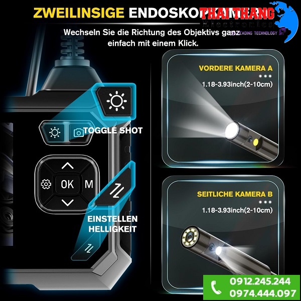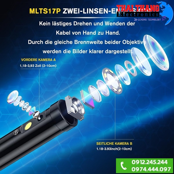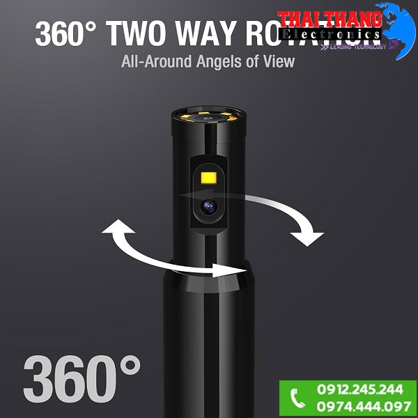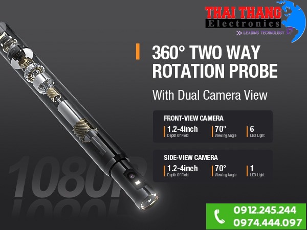 - 2 camera: chính ở đầu và camera phụ ở mặt bên - Cảm biến CMOS màu - Xoay 360 độ - Độ phân giải: 1920x1080, 1280x720 hoặc 640x480p - Góc mở rộng: 70 độ - Đường kính camera: 8mm - Độ dài tiêu cự: 2 đến 10cm |