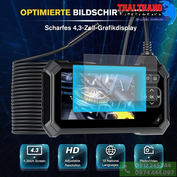 Chế độ chụp ảnh và ghi hình giúp người dùng lưu lại làm tài liệu phục vụ bảo trì hoặc sửa chữa, dữ liệu sẽ được lưu vào thẻ nhớ dễ dàng trích xuất (thẻ nhớ không kèm theo máy),hình ảnh sẽ hiển thị qua màn hình IPS màu, kích thước 4.3inch, độ phân giải 1080P cung cấp hình ảnh chân thật, sống động nhất,dây cab dài 1m loại bán cứng dễ dàng uốn cong theo cấu trúc đường ống.