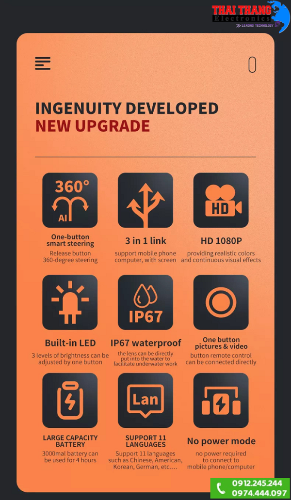 Camera nội soi đường ống TTI CNS3690 Màn hình màn hình IPS 3.5 inch màu + Camera nội soi đường kính 8.5mm dễ dàng luồn lách qua các đường ống,lốc máy kích thước nhỏ,hỗ trợ 6 LED có thể diều chỉnh được độ sáng tăng khả năng quan sát trong môi trường ánh sáng yếu,độ phân giải cao 1920x1080p,có thể kết nối với điện thoại di động hoặc máy tính,đầu camera có thể xoay 360°giúp người dùng sẽ dễ dàng quan sát đến các vị trí mong muốn,dây cable cứng dễ dàng uốn cong và luồn lách vào các khe hẹp, dây và camera đạt chuẩn chống nước IP67 cho phép sản phẩm hoạt động trong mối trường có dầu mỡ hoặc ngập nước.