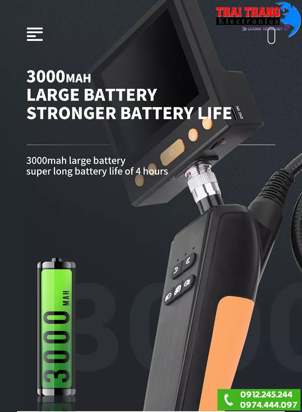 Camera nội soi lốc máy TTI CNS3690 Sử dụng nguồn là pin sạc dung lượng 3000mAh cho thời gian làm việc từ 3-4h,bộ điều khiển sử dụng chất liệu nhựa ABS độ bền cao,đầu camera cũng được bọc kim loại chống ăn mòn hoặc các tác động va đập mạnh, dây cable hợp kim cao cấp chống ăn mòn và chịu được nhiệt độ cao.