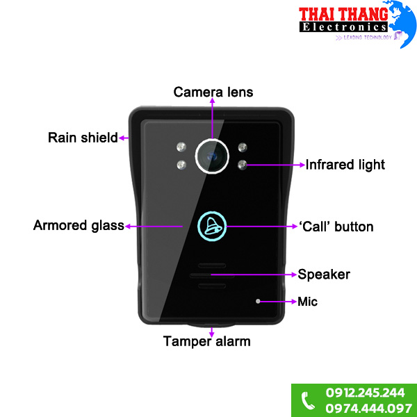 - CHUÔNG CỬA CÓ HÌNH KHÔNG DÂY này sử dụng sóng wireless không dây 2.4GHZ cực khỏe phạm vi thu phát rộng trong phạm vi 300m2 ở không gian mở không vướng vật cản với bước sóng khỏe như vậy bạn có thể dễ dàng lắp đặt ở mọi nơi bạn muốn mà không cần phải đi dây lằng nhằng gây mất thẩm mĩ và màn hình 3.5" cảm ứng độ phân giải cao cho hình ảnh rõ nét,đàm thoại âm thanh 2 chiều mà không cần tai nghe,có chế đọ chụp lại hình ảnh bộ nhớ trong có thể lưu được lên đến 200 kiểu ảnh,camera kỹ thuật số độ phân giải cao,góc quay rộng cho phép bạn quan sát được toàn cảnh bên ngoài,có 6 đèn led cực sáng giúp bạn quan sát trong đêm tối ...