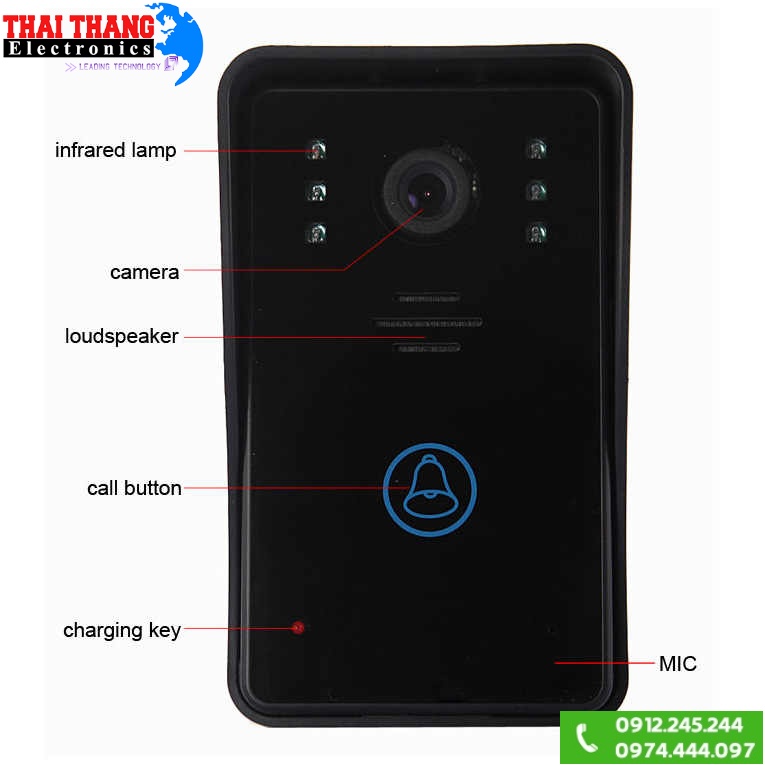 Mô tả và thông số kỹ thuật của bộ chuong cua man hinh khong day VDP735 : Specification: Features: * World Public Frequency 2.4G data Voice, image transmisssion * Full-duplex hands-free voice call, voice loud and clear * Visiting key wake up call, standby power-saving sleep * 83 effective communication channels, conversation can be stable in any environment * Improved automatically frequency-hopping technology, super error-correcting and anti-jamming capability * Consistent with national certification standards CE, CCC, FCC, R&NTTE * Ultrashort built-in antenna design, fashionable and attractive shape * Super-infrared ninght vision video surveillance capability * Operation temprature from -40 degree ... |