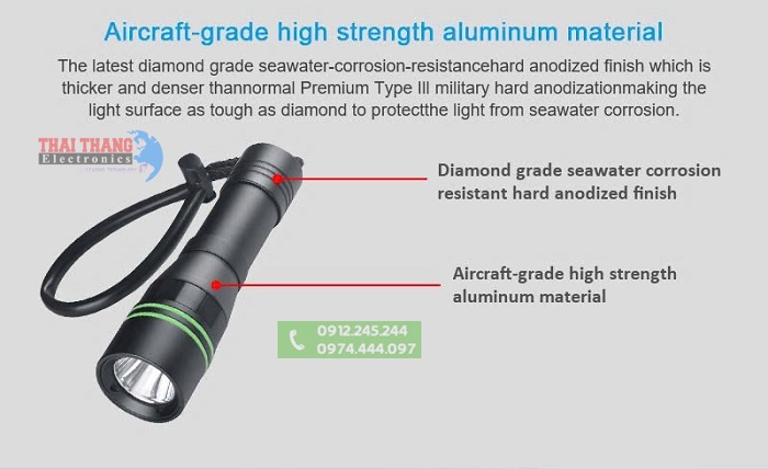 Đèn pin lặn Terino t51 Thân vỏ sử dụng chất liệu hợp kim nhôm hàng không cho trọng lượng nhẹ, độ bền cao,chống chịu va đập tốt, bên ngoài tráng phủ anodize ngăn ngừa ăn mòn oxy hóa,nguồn sử dụng pin sạc 18650 thông dụng cho thời gian hoạt động từ 1-5h ( tùy chế độ sáng )