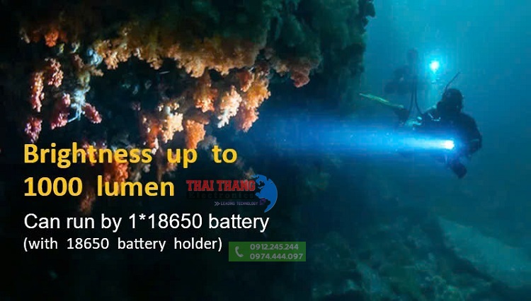 Đèn pin cho thợ lặn Terino T51 Trang bị chip led sáng trắng công suất 30w cho cường độ sáng lên đến 1000 lumens,nhiệt màu đạt 6000k siêu sáng,CRI 95 cho màu sắc chiếu sáng trung thực,chóa đèn tráng gương tăng hội tụ ánh sáng,cho khoảng cách chiếu xa từ 200-300m trên cạn và 30-50m khi dưới nước.