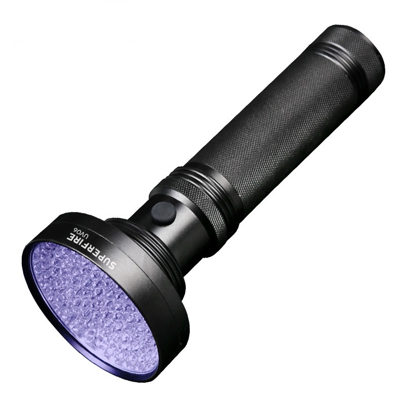 Đèn pin cực tím Supfire UV06 100 Led sử dụng cho các công việc như kiểm tra, tiền giả, giấy tờ giả, tem giả, chất photpho có trong tả giấy, mỹ phẩm, làm khô nhanh keo công nghiệp, kiểm tra vết nứt, phát hiện bụi bẩn, nước tiểu chó mèo,….
