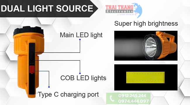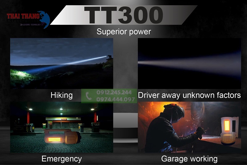 Đèn pin led xách tay Winning Light TT300 Trang bị chip led chính hãng cho độ bền lên đến 100000 giờ chiếu sáng,cường độ sáng đạt 900 lumens với công suất 20W cho khoảng cách chiếu xa từ 200-300m trong đêm tối nhờ chóa đèn thiết kế sâu được tráng gương bạc tăng khả năng hội tụ ánh sáng,ngoài led chính nhà sản xuất thiết kế thêm dải led COB trên thân đèn cho chùm sáng rộng phù hợp sử dụng trong gia đình khi mất điện,chiếu sáng sửa chữa máy móc,đọc sách,sử dụng trong hầm mỏ,trong lều trại khi du lịch dã ngoại….