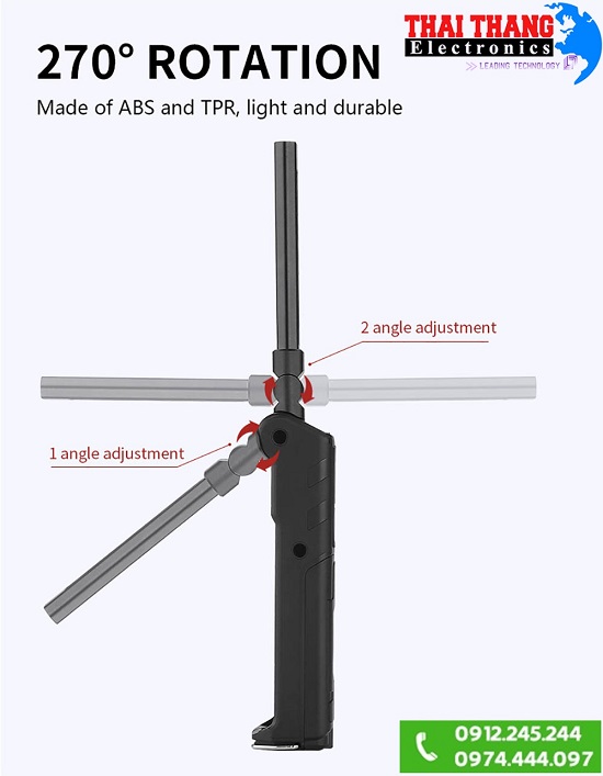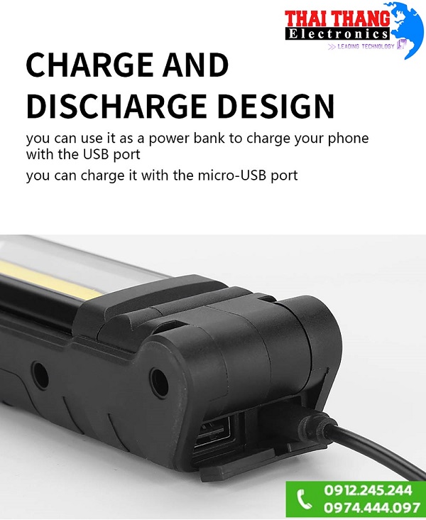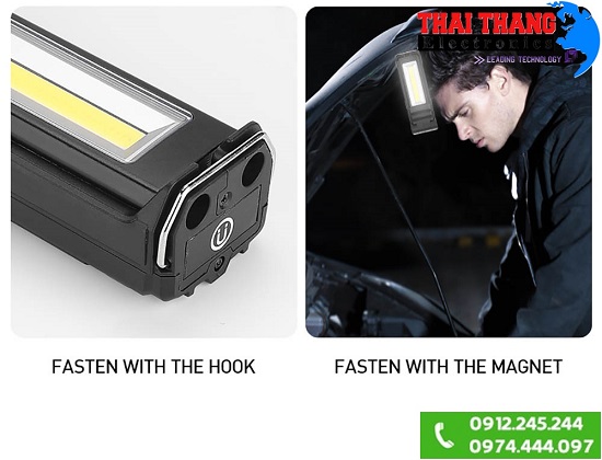 Phần thanh chiếu sáng của đèn có thể xoay 270° dễ dàng điều chỉnh góc chiếu sáng cho phù hợp với hoạt động sửa chữa trong không gian hẹp,các tính năng tiện dụng khác của đèn như tích hợp nam châm và móc treo ở đế giúp cố định đèn, cổng USB để sạc cho smartphone, đèn báo dung lượng pin và công tắc tăng giảm độ sáng dễ dàng.