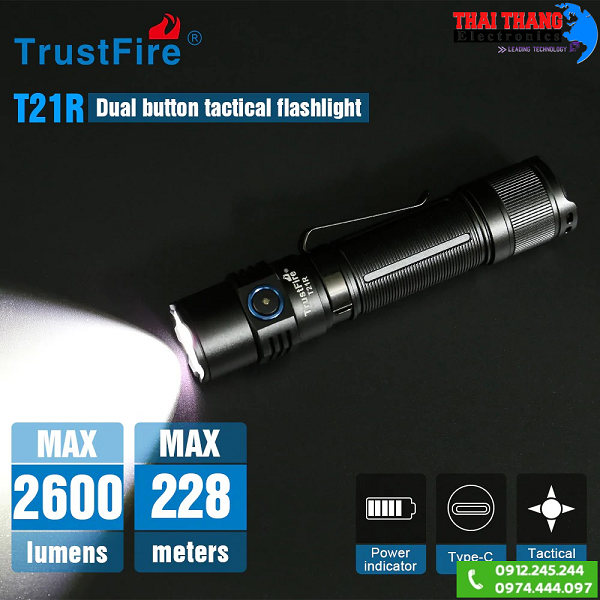 Đèn pin siêu sáng trustfire T21R Trang bị chip led chính hãng Mỹ cho cường độ sáng lến đến 2600 lumens, tuổi thọ bóng led đạt 100000h chiếu sáng,có 5 chế độ sáng gồm chế độ tiết kiệm (sáng trăng) 2 lumens, sáng vừa 100 lumens, sáng mạnh 425 lumens, siêu sáng 2600 lumens và chế độ nhấp nháy 2600 lumens, tùy vào đặc thù công việc mà người dùng sẽ chọn chế độ sáng phù hợp nhất.
