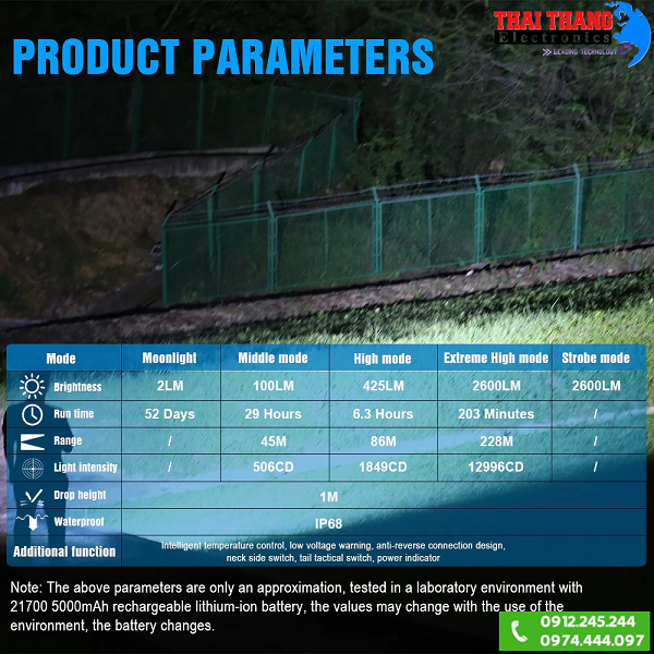 Thời gian chiếu: sáng mạnh 1500 lumens / 60 phút; sáng vừa 480 lumen / 3 giờ; sáng thấp 120 lumen / 20 giờ; nhấp nháy với độ sáng 1500 lumens