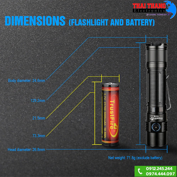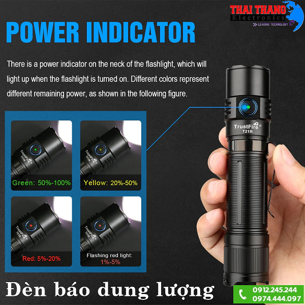 Đèn pin cầm tay siêu sáng trustfire T21R Sử dụng chất liệu hợp kim nhôm hàng không AL6061T6 cho trọng lượng nhẹ, chịu được va đập mạnh, hoặc rơi rớt ở độ cao 1m,bên ngoài phủ lớp Anodize tiêu chuẩn chống ăn mòn, oxy hóa,nguồn trang bị pin 21700 dung lượng đến 5000mAh cho thời gian sử dụng lến đến 52 ngày khi bật chế độ sáng trăng và 203phút khi ở chế độ siêu sáng.