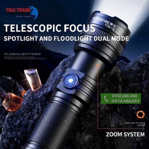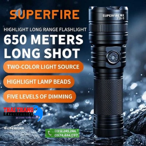Đèn pin chính hãng Superfire Y26S Sở hữu cường độ sáng lên đến 850LM nhờ chip led Cree SH-S33 với độ sáng hơn 20% so với các dòng led khác,trang bị công nghệ bóng LED hoàn toàn mới cho phép tuỳ chỉnh chiếu sáng bằng ánh sáng trắng hoặc vàng,phạm vi chiếu xa đạt 650m với ánh sáng tỏa rộng nhờ vào lens thiết kế dạng gương cầu,tính năng zoom tụ tỏa cũng giúp người dùng điều chỉnh chùm tia rộng hay hẹp cho phù hợp với từng công việc,hỗ trợ 5 chế độ sáng gồm sáng yếu,sáng trung bình,sáng mạnh,nhấp nháy và SOS.