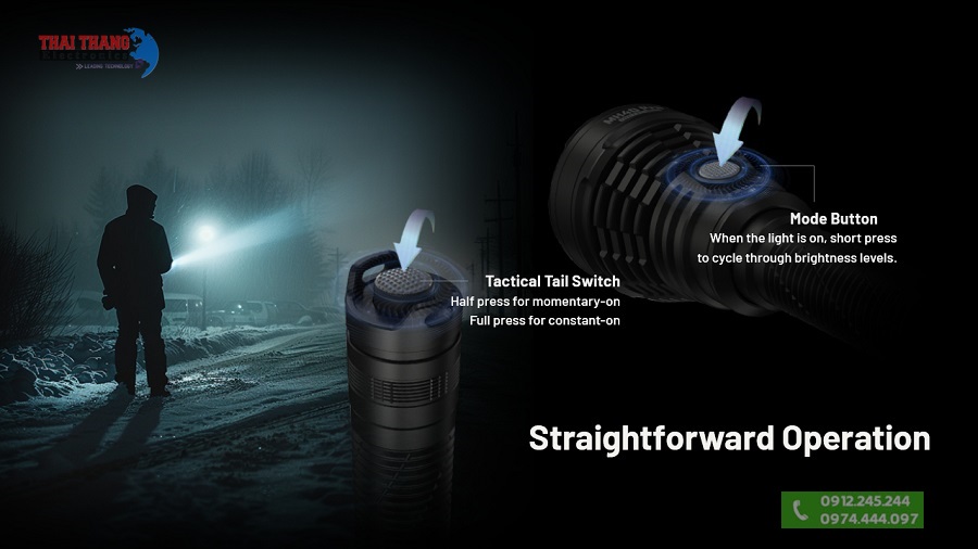 Thiết kế chóa đèn sâu,tráng phủ gương phản quang cao cấp giúp tia sáng hội tụ cho chùm sáng xa đạt 1300m,đi kèm công tắc phụ kết nối không dây khoảng cách 1m giúp người dùng dễ dàng tháo tác tắt bật không cần chạm vào đèn, thân vỏ sử dụng chất liệu hợp kim nhôm siêu bền cho trọng lượng nhẹ,tản nhiệt tốt,chống chịu va đập rơi rớt độ cao 1m,bề mặt được phủ Anodized cao cấp chống ăn mòn,oxy hóa,công nghệ ATR (advanced temperture regulation ) giúp tản nhiệt tốt,tránh quá nhiệt ngay cả khi hoạt động trong thời gian dài.