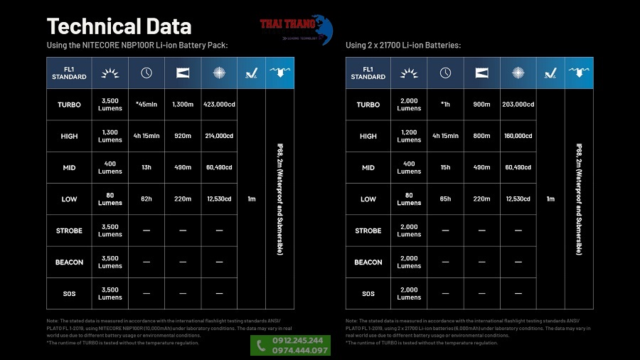Thời gian chiếu: sáng mạnh 1500 lumens / 60 phút; sáng vừa 480 lumen / 3 giờ; sáng thấp 120 lumen / 20 giờ; nhấp nháy với độ sáng 1500 lumens