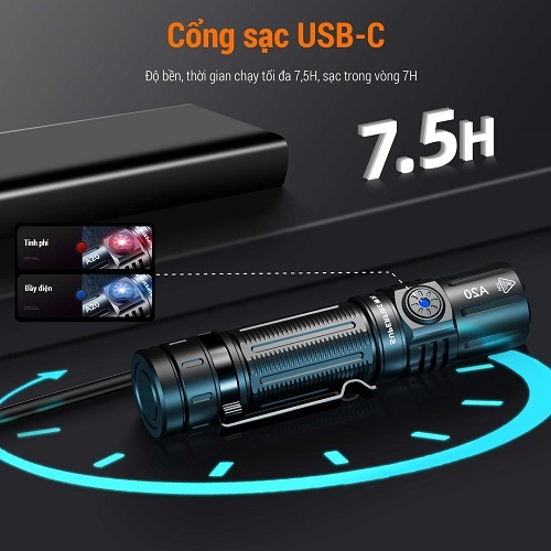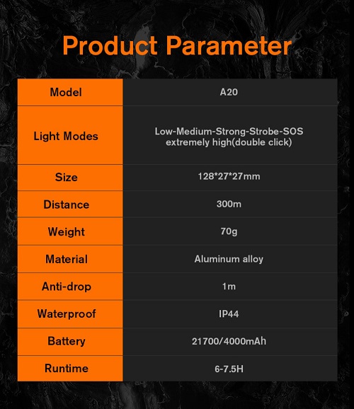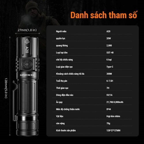 Đèn pin mini siêu sáng superfire A20 Sử dụng nguồn là pin sạc 1 pin 21700,cho thời gian chiếu sáng từ 1-7h ( tùy chế độ sáng ) ,chuẩn IP44 chống bụi,chống nước ( đi mưa ) giúp người dùng yên tâm sử dụng trong mọi điều kiện thời tiết khắc nghiệt nhất.