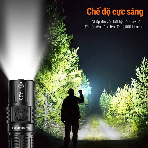 Đèn pin cầm tay siêu sáng superfire A20 Trang bị chip led chính hãng có độ sáng cao cùng thiết kế nhỏ gọn,phù hợp cho nhiều công việc yêu cầu khoảng cách soi xa, ánh sáng tỏa rộng,và cường độ sáng cao,các hoạt động ngoài trời trong đêm tối, tuần tra,cứu hộ, đi rừng, trang trại, cắm trại,câu cá, các hoạt động chiếu sáng cá nhân,….