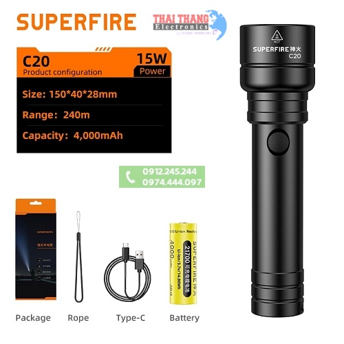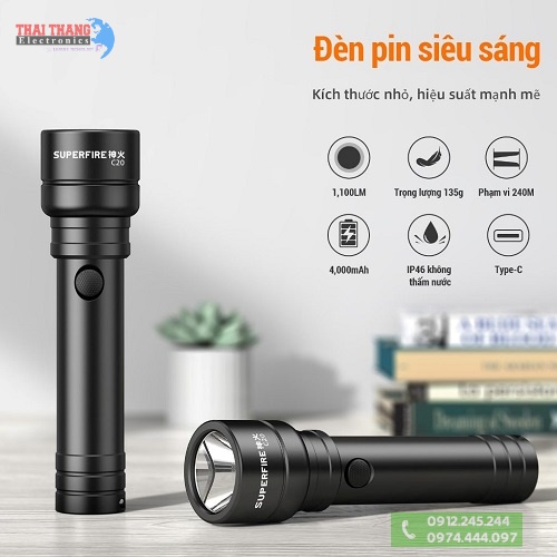 Đèn pin cầm tay siêu sáng superfire C20 Trang bị chip led chính hãng có độ sáng cao cùng thiết kế nhỏ gọn,phù hợp cho nhiều công việc yêu cầu khoảng cách soi xa, ánh sáng tỏa rộng,và cường độ sáng cao,các hoạt động ngoài trời trong đêm tối, tuần tra,cứu hộ, đi rừng, trang trại, cắm trại,câu cá, các hoạt động chiếu sáng cá nhân,….