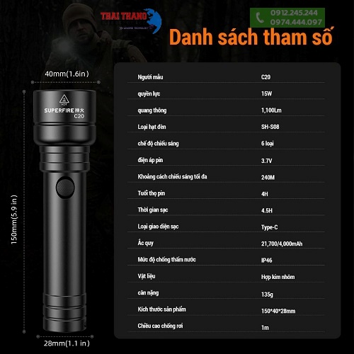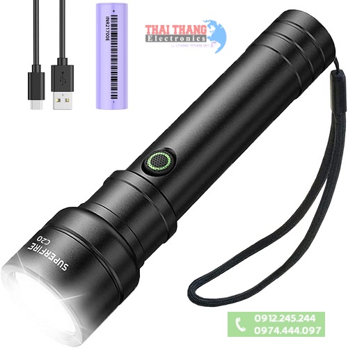 Đèn pin mini siêu sáng superfire C20 Sử dụng nguồn là pin sạc 1 pin 21700,cho thời gian chiếu sáng từ 1-5h ( tùy chế độ sáng ) ,chuẩn IP46 chống bụi,chống nước ( đi mưa ) giúp người dùng yên tâm sử dụng trong mọi điều kiện thời tiết khắc nghiệt nhất.
