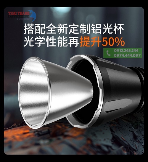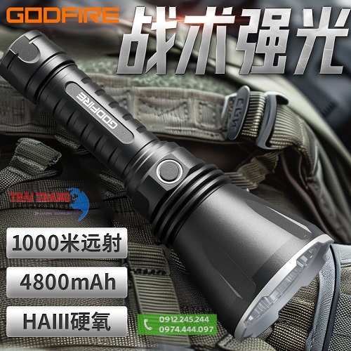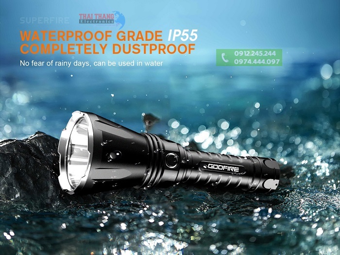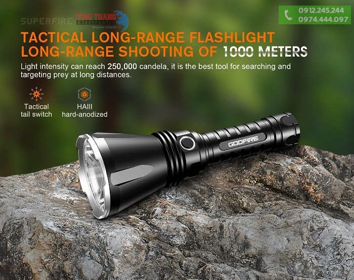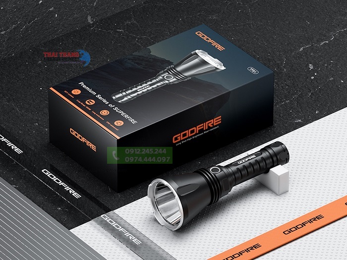 Đèn pin siêu sáng Superfire GODFIRE TF01 Sử chip LED OSRAM thế hệ mới kết hợp cùng chóa đèn lớn,cường độ sáng của đèn lên đến 1371lm cho khoảng cách chiếu xa 1000m, được trang bị 5 chế độ gồm sáng thấp,sáng trung bình,sáng cao,tăng áp siêu sáng và nhất nháy,phù hợp cho nhiều mục đích chiếu sáng,chóa đèn cũng được thiết kế nhẵn sâu, sử dụng chất liệu nhôm tráng gương phản xạ ánh sáng cao cho tia sáng gom và chiếu xa.