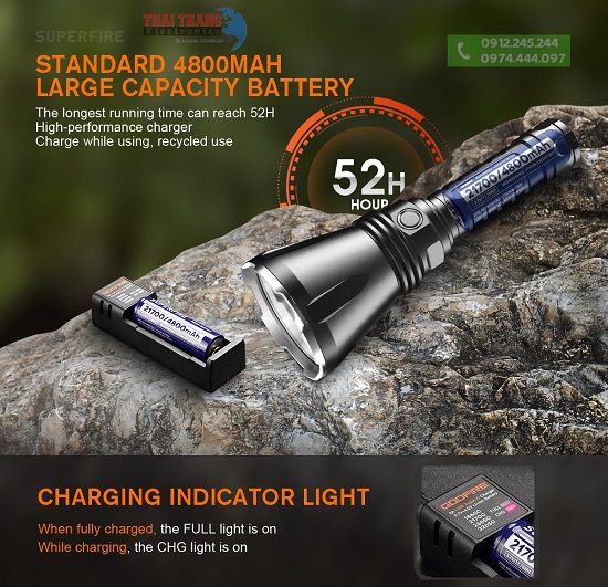 Đèn pin mini siêu sáng Superfire Godfire TF01 Nguồn điện cung cấp là pin sạc 21700 dung lượng cao cho thời gian chiếu sáng liên tục 146 phút với chế độ tăng áp siêu sáng và 190 phút cho chế độ siêu sáng , tối đa 52h cho chế độ sáng thấp tiết kiệm pin.