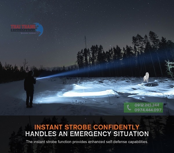 Các chế độ sáng: High - Mid - Low - Strobe (ấn 2 lần nút bấm sẽ kích hoạt chế độ nhấp nháy strobe)