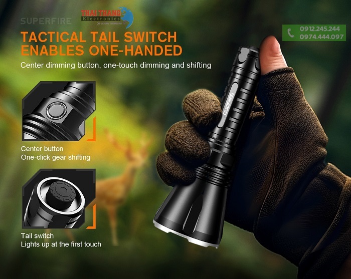Công tắc đuôi chiến thuật giúp dễ dàng thao tác bật/tắt và công tắc phụ trên thân có chức năng chuyển các chế độ sáng khác nhau chỉ cần một lần nhấn chạm,sử dụng chất liệu hợp kim nhôm cho trọng lượng nhẹ, đồng thời mang lại độ bền cao, có thể chịu các tác động như ăn mòn, oxy hóa,chống chịu va đập tốt,tiêu chuẩn chống nước,chống bụi IP55 cho phép người dùng sử dụng đèn trong mọi điều kiện thời tiết.