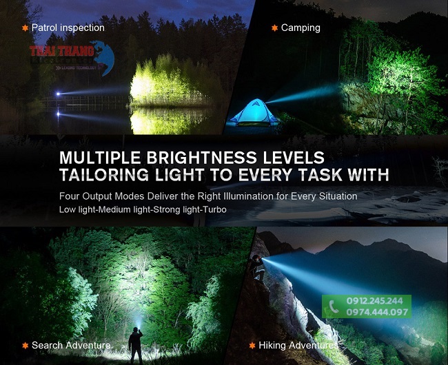 Thời gian chiếu: sáng mạnh 1500 lumens / 60 phút; sáng vừa 480 lumen / 3 giờ; sáng thấp 120 lumen / 20 giờ; nhấp nháy với độ sáng 1500 lumens